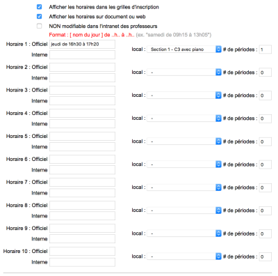 - NON modifiable dans l'intranet des professeurs : grâce à l'option “intranet”, le professeur édite lui-même son horaire de cours.