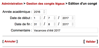 La définition des congés légaux est nécessaire pour la gestion de l'Occupation des locaux et remises de cours.