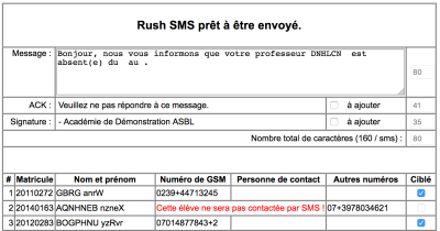 - signale en rouge les élèves qui ne seront pas contactés, soit parce qu'ils n'ont pas renseigné un GSM, soit parce que le menu local associé au numéro de téléphone n'est pas positionné sur GSM.