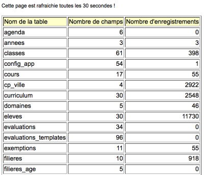 Lesahrweb ouvre une nouvelle fenêtre ou un nouvel onglet, puis affiche la liste des tables définies dans la base de données ; pour chaque table, le nombre de rubriques (champs) et le nombre d'enregistrements.