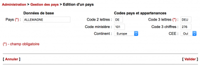 Le code ministère, au moment de la rédaction de cette page, n'est plus utilisé. Il attribuait à chaque pays un code numérique selon des règles propres à la Fédération Wallonie Bruxelles.
