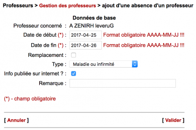 Libérer les locaux occupés : dans le cadre de la gestion des locaux, Lesahrweb doit savoir quels locaux sont occupés ou libres.Info publiée sur internet ? : une option pour afficher sur votre site internet des données provenant directement de LesahrWeb. Dans pareil cas, il y a lieu de préciser si l'absence du professeur doit être renseignée sur votre site public.[ Valider + SMS ] : cette commande permet d'enregistrer les données, puis de passer immédiatement à la fonction Envoi SMS (Documents internes, listes d'élèves), avec
