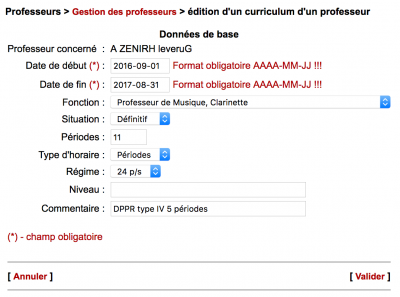 Sous les absences, sont listés les curriculums du professeur, soit tous ses engagements au sein de l'école (à condition que vous les ayez encodés). Les commandes d'édition habituelles sont présentes,