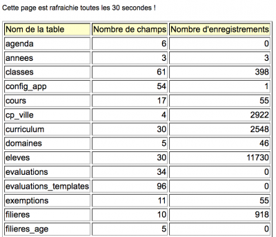 Lesahrweb ouvre une nouvelle fenêtre ou un nouvel onglet, puis affiche la liste des tables définies dans la base de données ; pour chaque table, le nombre de rubriques (champs) et le nombre d'enregistrements.