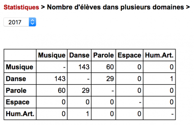 Lesahrweb dessine un tableau où les domaines sont repris à la fois en abscisse et en ordonnées. Il note aux intersections le nombre d'élèves inscrits aux deux domaines.