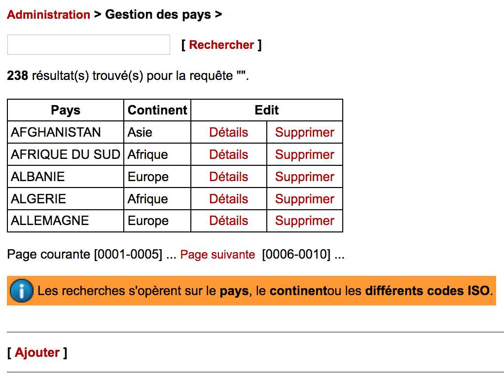 - Administration du système : gestion des pays